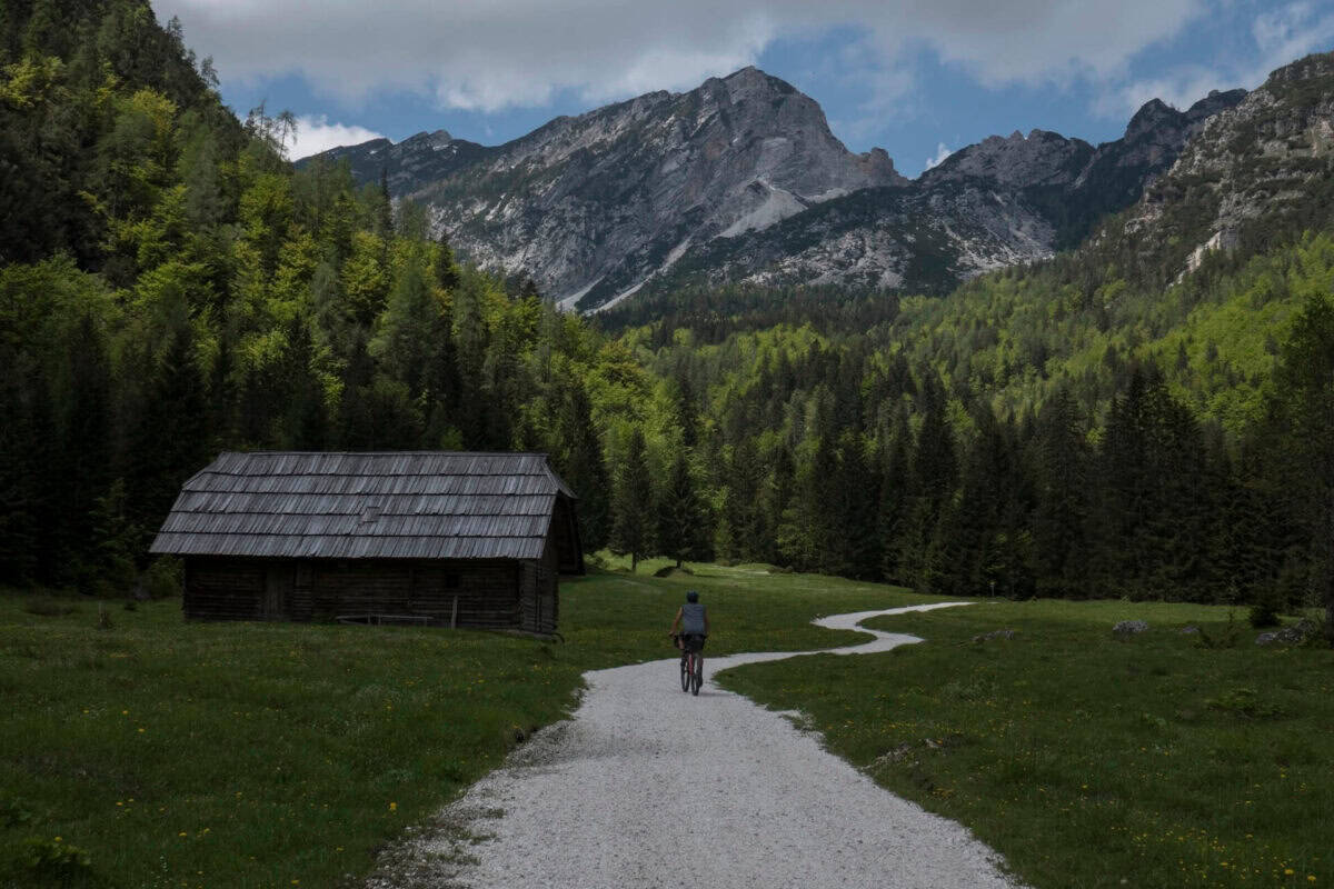 Le long de la rivière Pišnica, après le lac Jasna, sur la route principale qui traverse le col de Vršič du côté de Primorska, nous pédalons jusqu’au cœur des montagnes qui ferment une autre vallée orientée vers le sud, Krnica. Tout au long du trajet depuis Kranjska Gora, nous pouvons voir le magnifique rideau de murs juliens escarpés au cœur duquel, ou mieux, au pied duquel, nous nous dirigeons.